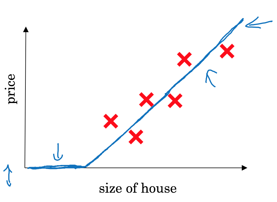 深度学习往往关联于大规模神经网络的训练,本章我们即来了解下何谓神经网络。以经典的房屋价格预测为例,假设我们拥有六组房屋数据,每组包含了房屋的面积以及价格;我们希望寻找合适的函数来根据房屋的尺寸预测房屋价格。如果我们采用线性回归来解决这个问题,我们会画出一条 y = kx + b 这样的函数线,其形式如下黑色线所示:
