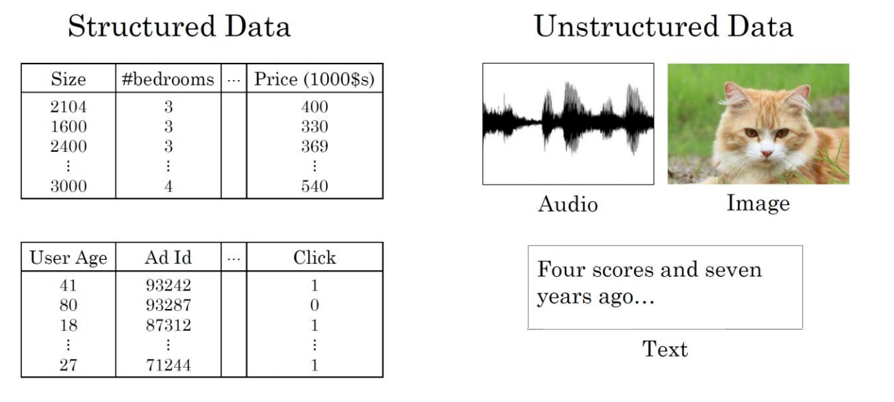 模型训练中我们常见的另一组概念就是结构化数据与非结构化数据,结构化数据有点类似于关系型数据库中存放的数据;譬如上面介绍的房屋价格预测中,我们会拥有包含了尺寸、卧室数等列的数据表,这种形式的就是所谓结构化数据。结构化数据中每个特征,譬如房间尺寸、卧室数目、用户年龄等都有可解释的意义;而非结构化数据的典型代表,语音、文本或者图片,往往会使用像素值或者单个词作为特征向量的组成,这些特征值往往很难有实际意义的解释。人类经过长时间的进化之后能够较好地辨析非结构化数据,而利用深度学习技术,现在机器也在不断提升自身对于非结构化数据的辨析能力。