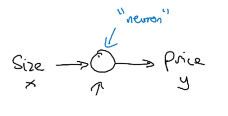 我们知道房屋的价格不可能为负数,因此我们可以将使用 ReLU(Rectified Linear Unit)函数来描述尺寸与价格之间的关系,如上图蓝色线型所示。我们可以将该问题抽象为输入为房间的尺寸 x,输出为房间的价格 y,而某个神经元即为接受输入并且进行合适的运算之后输出目标值的函数: