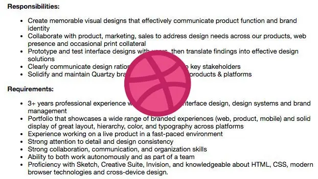 专注一件事并没错,不论做什么行业,都需要专注,但是专注的本身,并不是按照『技能』来衡量,很多时候做某件事,你专注的某个领域,是需要很多技能才能完成的,我所认为的专注,应该是对某一个擅长领域的由浅入深的理解和驾驭,而不是在某一个擅长领域的某个技能的驾驭和熟练程度。况且,市场变化非常快,你得适应市场适应社会,而不是逆行。打个最简单的比方,大家看看Dribbble上的一些公司的属于界面设计师岗位的招聘要求,对于设计师而言,至少都是需要一些交互、代码、市场研究、运营推广、团队协作等方面的综合能力,再看看一些国外知名公司的招聘条件,在这些综合能力需求的基础上,更加严格,也具有更深的层次。下图是Dribbble上的还不是非常知名的公司的设计师招聘需求,仅供参考: