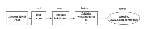 DNS 服务器中的所有信息都是按照域名以分层次的结构来保存的,层次有点号来划分:主机名.次级域名.顶级域名.根域名(host.sld.tld.root),越靠近右边级别越高,所有域名后面都是带有根域的,但是一般都省略掉了。