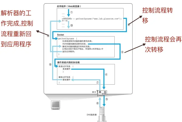 通过 DNS 查询 IP 地址的操作称为域名解析,负责执行解析这一操作的就叫解析器。 解析器实际上是一段程序,它包含在操作系统的 Socket 库中 (Socket 库可以让其他的应用程序调用操作系统的网络功能 )。