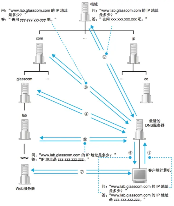 首先运营商服务从已经配置好的信息中拿到根域名的IP地址(这里假设根域只有一个,实际是想13个根域发起请求),然后像根域发起请求群问:"请问http://www.lab.glasscom.com的IP地址是多少?",根域名查询记录数据后没有找到,回答:"我不知道它的IP地址,不过我知道.com的权威服务器(ns)的地址,它是xxx.xxx.xxx.xxx,你去问它吧"。运营商服务运营商服务拿到.com的IP地址,根据IP地址发起另一个请求去询问.com服务器问:"请问 http://www.lab.glasscom.com的ns的IP地址是多少?",.com域服务器查找自身记录数据后回答:“我不知道,我只知道.http://glasscom.com的IP地址”。 以此类推,只要重复前面的步骤,就可以顺藤摸瓜找到目标DNS服务器,只要向目标DNS 服务器发送查询消息,就能够得到我们需要的答案,也就是 http://www.lab.glasscom.com 的 IP 地址了。