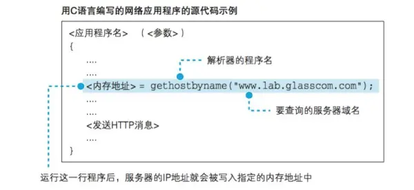 解析器的用法非常简单,编写应用程序(这里也就是指浏览器)时,如下图写上解析器的程序名称(gethostbyname)以及web服务的域名(http://www.lab.glasscom.com/)进行调用就可以了,这样就完成了对解析器的调用。