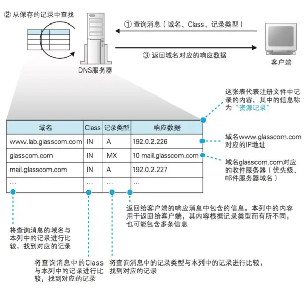 DNS 服务器上事先保存有前面这 3 种信息对应的记录数据,DNS 服务器的基本工作就是根据需要查询的:域名和记录类型查找相关的记录,并向客户端返回响应消息。