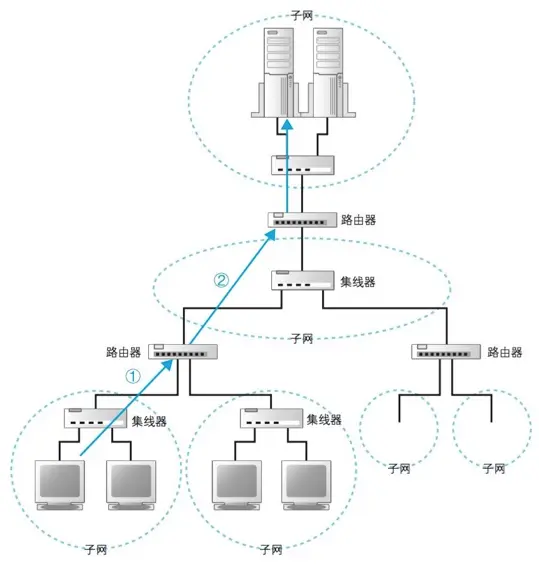 发送者发出的消息先经过子网中的集线器,转发到最近的路由器,接下来路由器会根据消息的目的地判断下一个路由器的位置,然后将消息发送到下一个路由器(即消息再次经过子网内的集线器被转发到下一个路由器),前面的过程不断重复,最终消息被传送到了目的地。