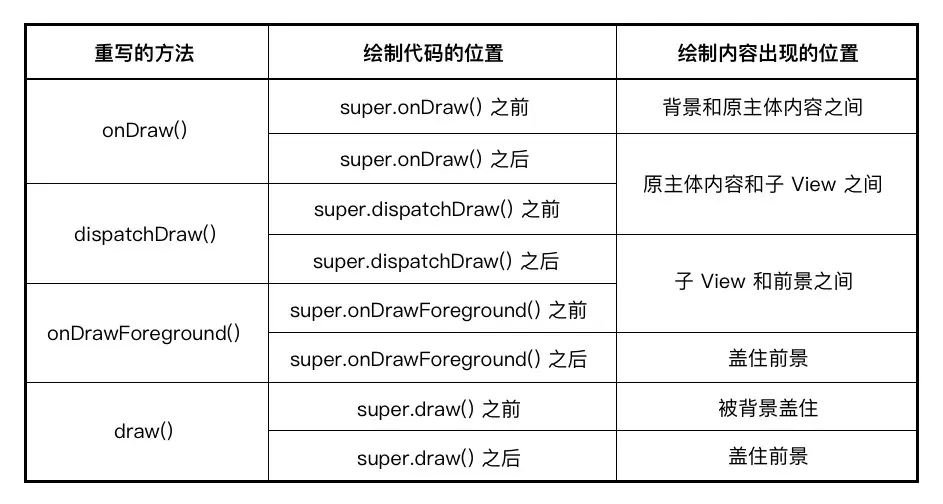 今天的内容就是这些:使用不同的绘制方法,以及在重写的时候把绘制代码放在 super.绘制方法() 的上面或下面不同的位置,以此来实现需要的遮盖关系。下面用一张图和一个表格总结一下: