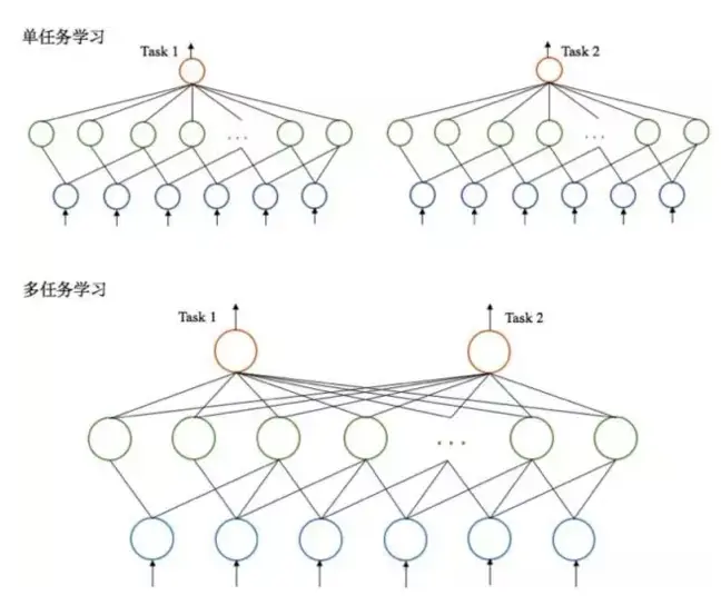 通过 NN 实现多任务学习的思路比较直观,如下图所示。图片上方是使用 NN,做单任务学习的示意图,不同任务间并无任何关联,即“一心一意”。图片下方是使用 NN,进行多任务学习的模型示意图,可以看到两个任务共享一些神经网络层及其相关联的模型参数,但输出层对应两个不同的任务,以此来实现多任务学习。