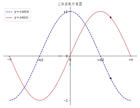 如果想要设置记号标签(我们可以把 3.1423.142 当做是 ππ,但毕竟不够精确。当我们设置记号的时候,我们可以同时设置记号的标签。注意这里使用了 LaTeX)。可以传入两个对应的列表。plt.legend(loc=随机默认):添加图例,图例来自于plt.plot()参数里的label,如果想让label按照公式显示,需要在字符串前后加$。即:label='$sin(x)$'