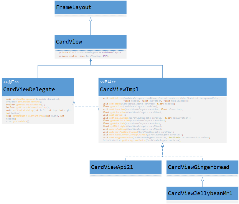 CardView内部根据不同版本系统实例化对应的CardViewImpl对象,CardViewImpl对象通过CardViewDelegate对象与CardView交互。