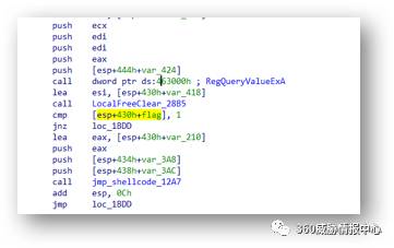 当RegQueryValueExA查询到的Data键值存在数据时,则进入后门执行流程,该流程利用配置信息中的Key解密shellcode_3并执行,解密出的shellcode_3主要功能是建立后门。
