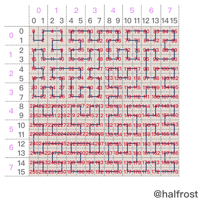 lookupIJ 数组里面记录了反向的信息。lookupIJ 数组 和 lookupPos 数组存储的信息正好是反向的。lookupIJ 数组 下表存的值是 lookupPos 数组 的下表。我们查 lookupIJ 数组 ,lookupIJ[17]的值就是8,对应算出来(i,j)=(0,2)。这个时候的i,j还是大格子。还是需要借助 posToIJ 数组 里面描述的形状信息。当前形状是轴旋转,之前也知道 orientation = 1,由于每个坐标里面有4个小格子,所以一个i,j代表的是2个小格子,所以需要乘以2,再加上形状信息里面的方向,可以计算出实际的坐标 (0 * 2 + 1 , 2 * 2 + 0) = ( 1,4) 。