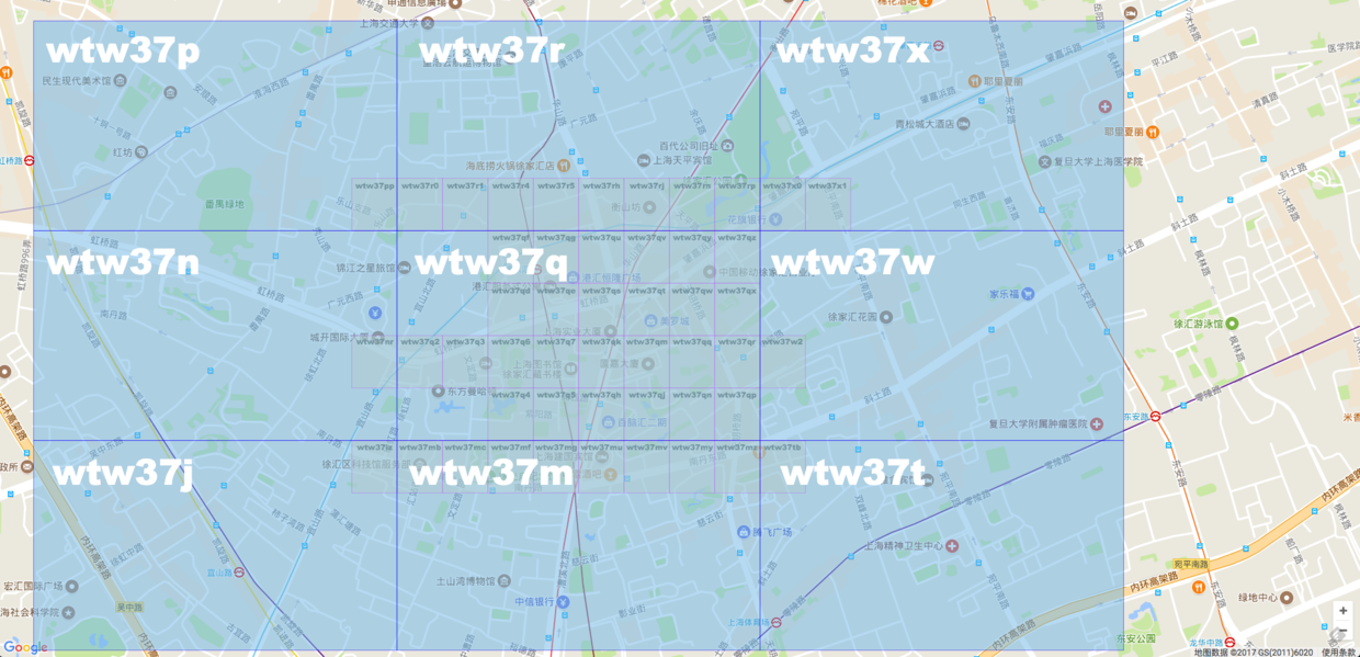 可以看到中间大格子的 Geohash 的值是 wtw37q,那么它里面的所有小格子前缀都是 wtw37q。可以想象,当 Geohash 字符串长度为5的时候,Geohash 肯定就为 wtw37 了。