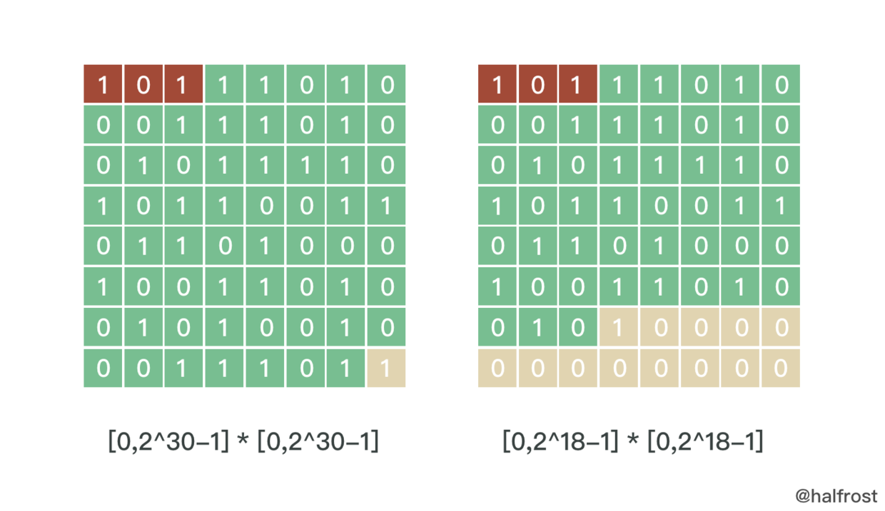 绿色格子有多少个就能表示划分多少格。上图左图,绿色的有60个格子,于是可以表示[0,2^30^ -1] * [0,2^30^ -1]这么多个格子。上图右图中,绿色格子只有36个,那么就只能表示[0,2^18^ -1]*[0,2^18^ -1]这么多个格子。