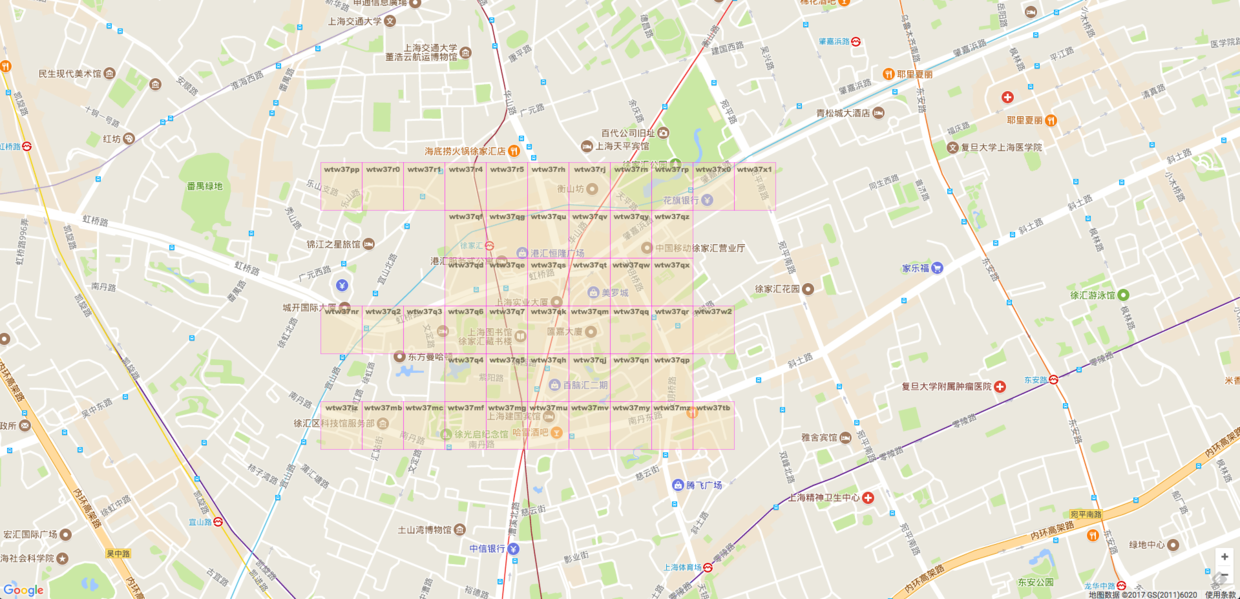 当Geohash 增加到7位的时候,网格更小了,美罗城的 Geohash 变成了 wtw37qt。