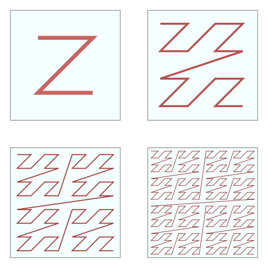 上图就是 Z 阶曲线。这个曲线比较简单,生成它也比较容易,只需要把每个 Z 首尾相连即可。