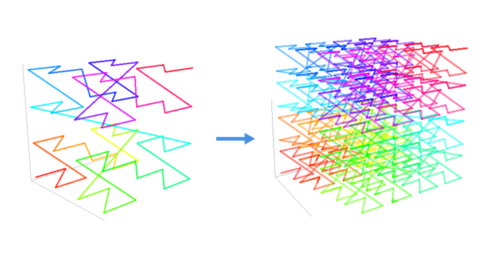 Z 阶曲线同样可以扩展到三维空间。只要 Z 形状足够小并且足够密,也能填满整个三维空间。