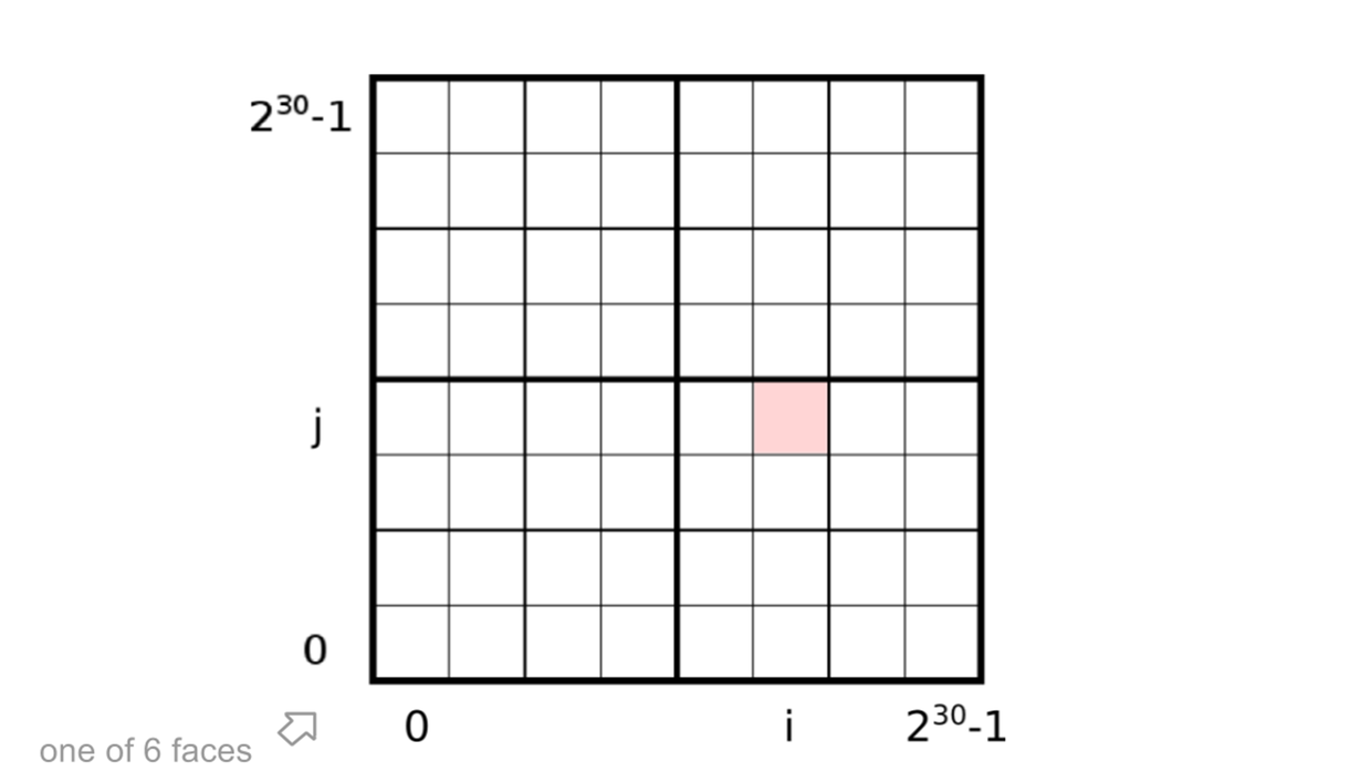 在 S2 中,每个 CellID 是由64位的组成的。可以用一个 uint64 存储。开头的3位表示正方体6个面中的一个,取值范围[0,5]。3位可以表示0-7,但是6,7是无效值。