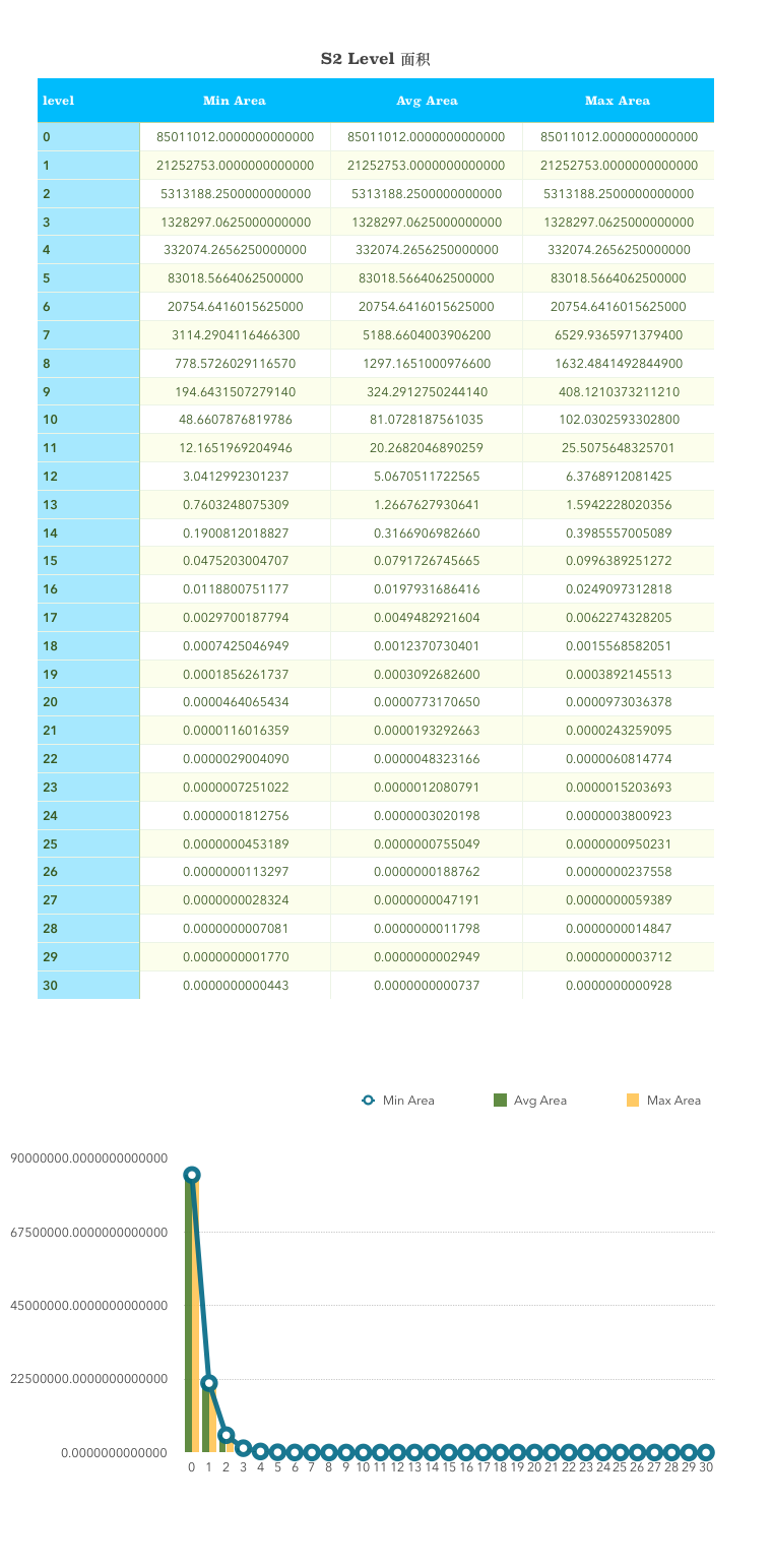 level 0 就是正方体的六个面之一。地球表面积约等于510,100,000 km^2^。level 0 的面积就是地球表面积的六分之一。level 30 能表示的最小的面积0.48cm^2^,最大也就0.93cm^2^ 。