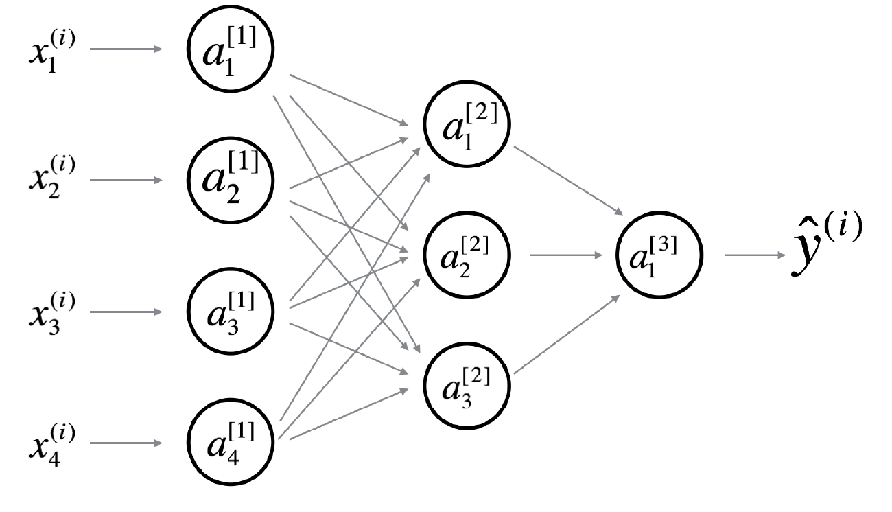 - $\hat{y} \in R^{n_y}$:输出的预测向量,也可以表示为 $a^{[L]}$,其中 $L$ 表示网络中的总层数。