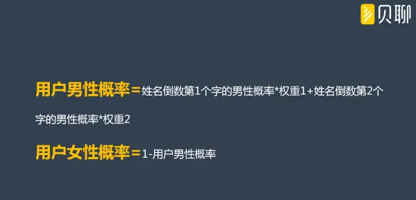 基于用户信息的用户性别识别模型构建非常简洁,因为是文本数据,也不需要用到相对复杂一些的逻辑回归等算法,模型构建的思路基本上是“词性—性别概率”关系库构建的逆过程。姓名的识别概率公式如下图: