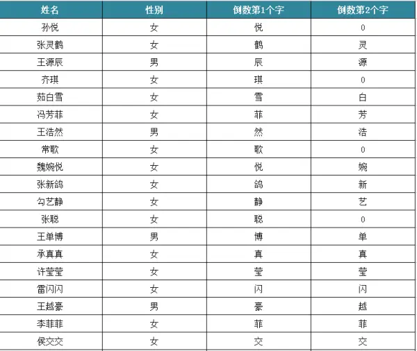 因为姓名+性别不能大概率锁定出唯一的用户,所以姓名和性别的数据敏感度并不高,通过百度等搜索引擎可以轻松获得,这里不详述。贝聊有自身的数据样本,并且进行了数据脱敏处理,初期过滤了一个十多万条“姓名—性别“的高精度种子样本库(已足够用!),并进行分词处理,结果库如下图(图中数据并非贝聊真实用户,仅是演示案例!)