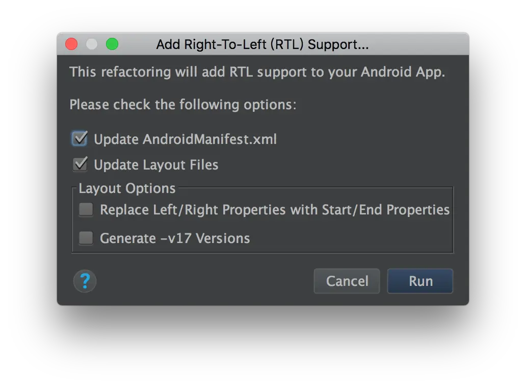 AS 支持一键适配 RTL,主要是在原来 Layout 中设置 Left 和 Right 属性的补充添加 Start 和 End 属性(你们在写布局的时候是不是很少用到 paddingStart、marginStart?接下来你们写布局的时候可不能再偷懒了,该加的还是得加上)