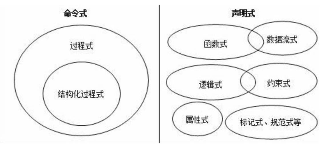 在编程范式上,我们需要理解编程语言的两个分类——命令式编程和声明式编程——的设计思想。其中,非命令式的编程都可归为声明式编程,命令式、函数式和逻辑式是最核心的三种范式。可以用下图来表示。