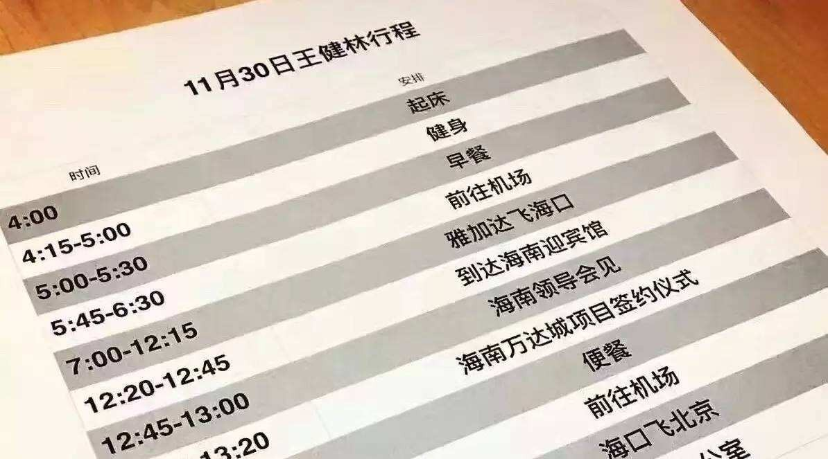 12月1日,万达集团官微在微博晒出了王健林一天的行程表,调侃道,“首富的日程单泄露了…”从行程表中可以看到,11月30日,王健林早上四点便已起床,先是健身45分钟,之后才吃早餐,生活也是健康得很。