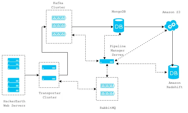 HackerEarth使用Django作为其主要WEB开发框架,并保存一些为性能和可扩展性定制的部件。在正常运行期间,我们的服务器平均每秒处理80-90个请求,而当多个竞争在一个时间差上重叠时,这会激增到每秒200-250个请求。我们需要一个系统,它能够很容易的扩展以满足高峰期流量每秒500个请求。另外,该系统应该添加最小处理开销到web服务器上,而收集到的数据应该存储以用于运算和离线处理。