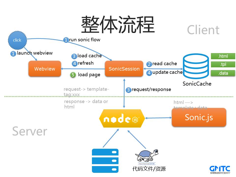 我们从第2步开始,SonicSession首先会去读取缓存。会抛个消息通知WebView读取缓存,如果Webview已经准备好,则直接加载缓存,如果没有,则缓存先放在内存里面。同时SonicSession也会带上模板等信息到后台拉取新的内容,后台经过Sonic-Diff之后,会返回新的数据。SonicSession拿到新的数据后,首先会跟本地数据进行Diff,如果发现WebView已经加载缓存,则直接提交增量数据给页面。否则继续拼接最新的页面,替换掉内存里面的缓存,同时保存到本地。这个时候WebView如果Ready,则直接进行第5步load最新的内容即可。