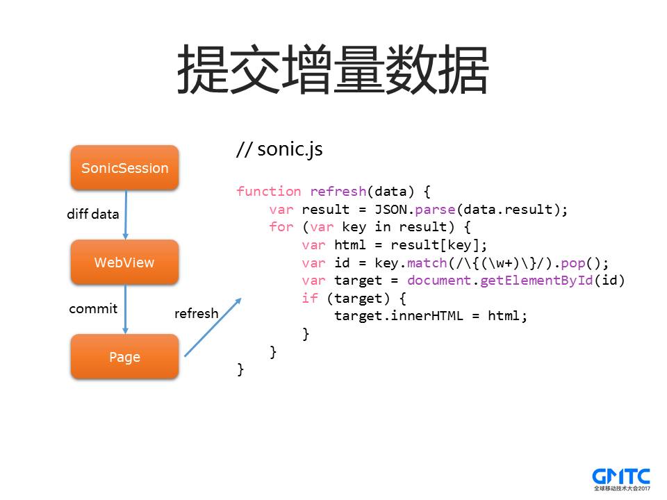 获得变化数据块(diff_data)后,客户端只需要通知页面页面设置的回调接口(getDiffDataCallback)进行界面元素更新即可。这里javascript的通信方式也可以自由定义(可以使用webview标准的javascript通信方式,也可以使用伪协议的方式),只要页面跟终端协商一致就可以。