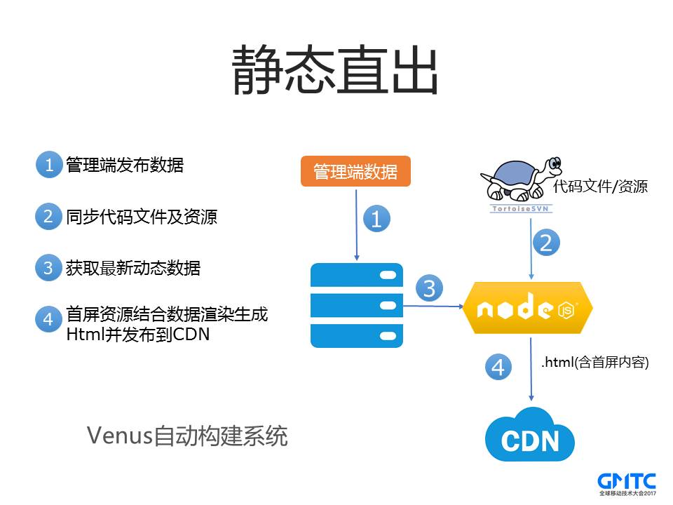 “直出”这个概念对前端同学来说,并不陌生。为了优化首屏体验,大部分主流的页面都会在服务器端拉取首屏数据后通过NodeJs进行渲染,然后生成一个包含了首屏数据的Html文件,这样子展示首屏的时候,就可以解决内容转菊花的问题了。 当然这种页面“直出”的方式也会带来一个问题,服务器需要拉取首屏数据,意味着服务端处理耗时增加。 不过因为现在Html都会发布到CDN上,WebView直接从CDN上面获取,这块耗时没有对用户造成影响。 手Q里面有一套自动化的构建系统Vnues,当产品经理修改数据发布后,可以一键启动构建任务,Vnues系统就会自动同步最新的代码和数据,然后生成新的含首屏Html,并发布到CDN上面去。