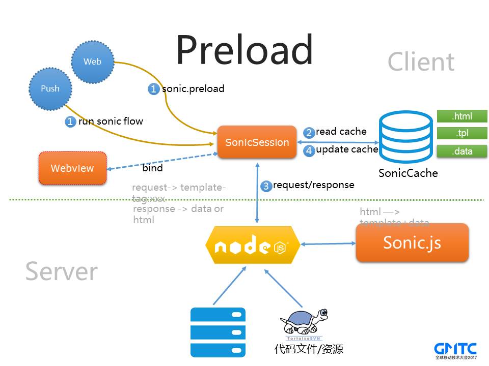 实际上整个SonicSession在没有WebView的情况下,也是可以独立完成所有逻辑的,当用户点击页面的时候,我们在将WebView和SonicSession绑定起来即可。于是我们支持了两种预加载的模式,一种是通过后台push的方式,来提前获取数据。还有一种就是JSAPI,页面可以调用JSAPI来预加载用户可能操作的下一个页面。通过这两种方式,我们可以把需要的增量更新数据提前拉取回来 。