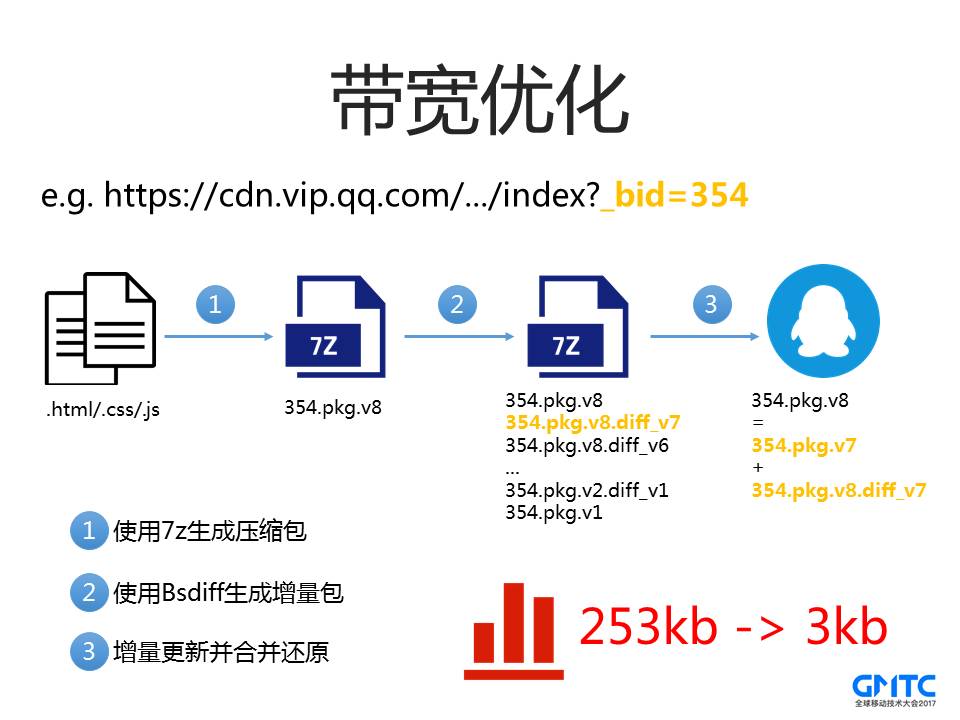 页面发布到CDN上面去后,那么WebView需要发起网络请求去拉取。当用户在弱网络或者网速比较差的环境下,这个加载时间会很长。于是我们通过离线预推的方式,把页面的资源提前拉取到本地,当用户加载资源的时候,相当于从本地加载,即使没有网络,也能展示首屏页面。这个也就是大家熟悉的离线包。 手Q使用7Z生成离线包, 同时离线包服务器将新的离线包跟业务对应的历史离线包进行BsDiff做二进制差分,生成增量包,进一步降低下载离线包时的带宽成本,下载所消耗的流量从一个完整的离线包(253KB)降低为一个增量包(3KB)。