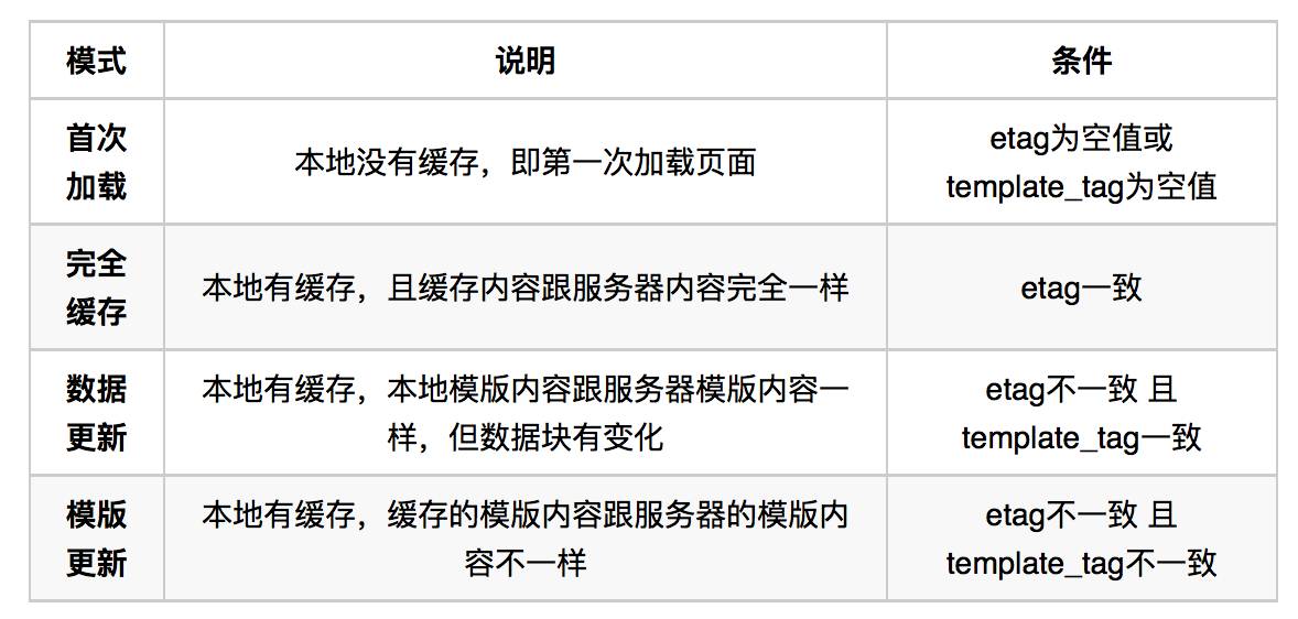 VasSonic根据本地是否有缓存以及本地缓存数据跟服务器数据的差异情况分为以下四种模式。