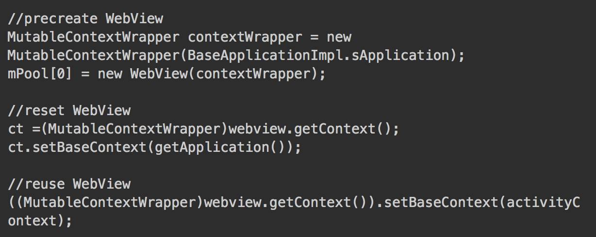 我们会将Activity context包在MutableContextWrapper里面,destory的时候,会将WebView的Context设置为Application的Context,从而释放Activity Context。 类似如下: