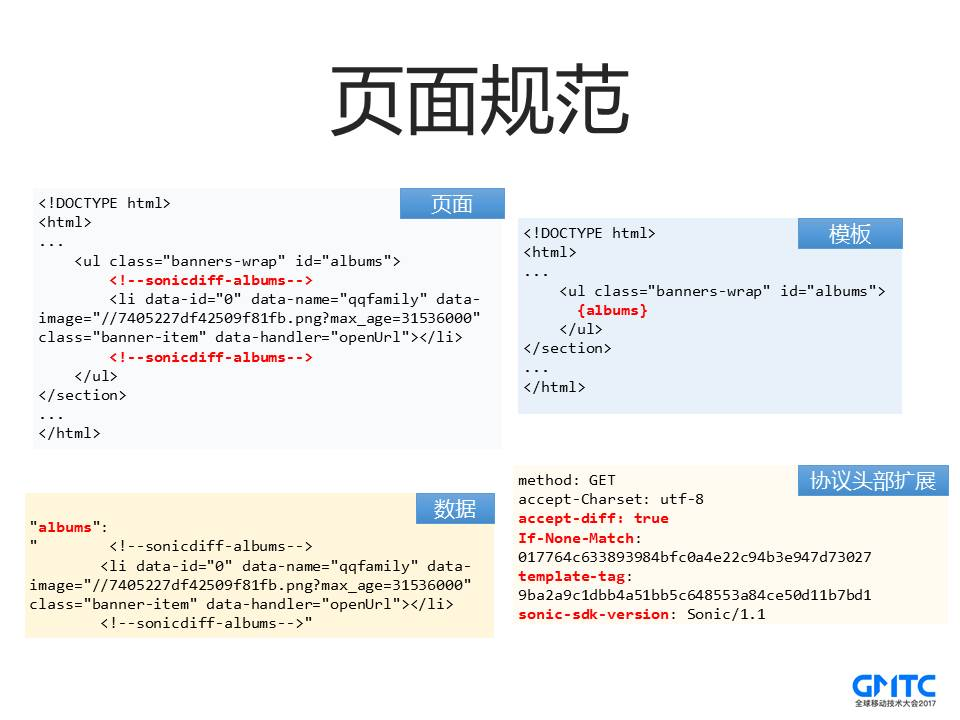 首先我们对Html内容进行了扩展,通过代码注释的方式,增加了“sonicdiff-xxx”来标注一个数据块的开始与结束。 而模板就是将数据块抠掉之后的Html,然后通过{albums}来表示这个是一个数据块占位。 数据就是JSON格式,直接Key-Value。 当然,为了完美地兼容Html,我们对协议头部进行了扩展,比如增加accept-diff来标注是否支持增量更新、template-tag来标注模板的md5是多少等。OK,有了上面这个规则或者公式后,我们就可以实现增量更新了。