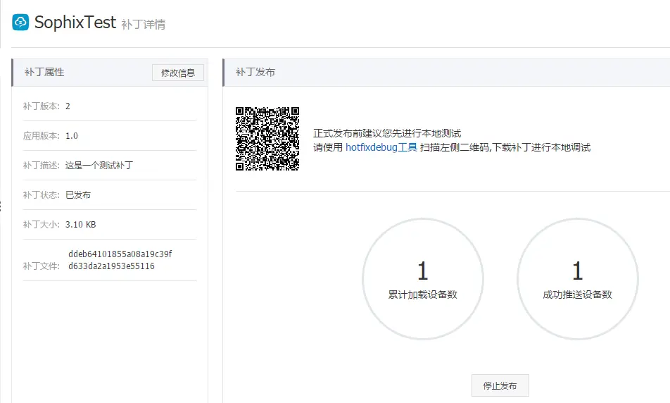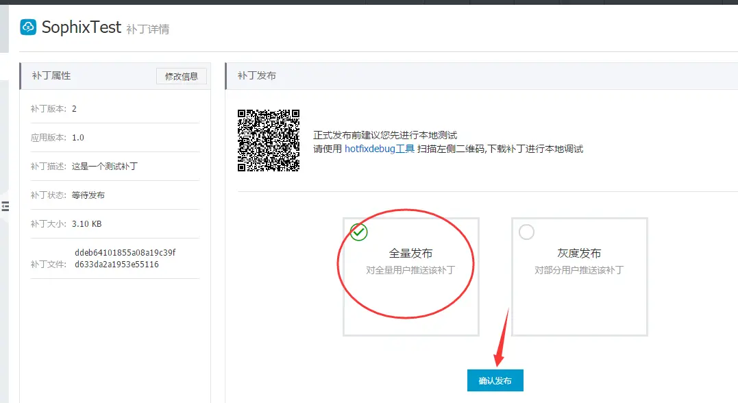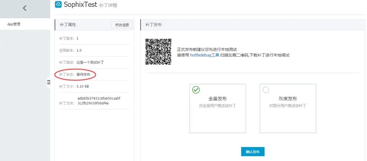 上传补丁后,查看补丁详情会发现,补丁状态是等待发布,阿里建议在正式发布前先使用hotfixdebug工具进行本地测试再发布,当然我们可以直接全量发布。