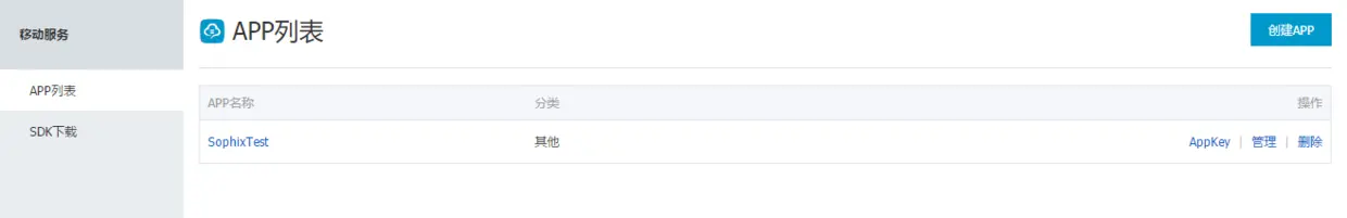 - 2、打开管理控制台,点击右上角创建APP