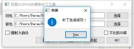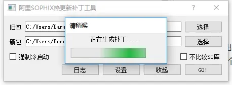 - a 、生成补丁的话需要下载阿里的打补丁工具SophixPatchTool,然后分别选择两次打包生成的apk。
