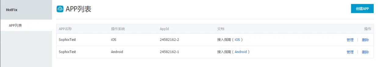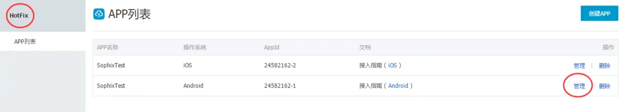 ps:这里需要的是注意,一个是移动服务APP列表,一个是Hotfix列表,两个列表需要区分一下。
