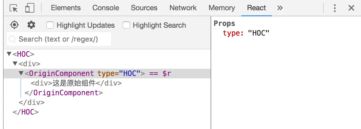 属性代理听起来好像很麻烦,然而从代码中看,就是使用HOC这个函数,向被处理的组件WrappedComponent上面添加一些属性,并返回一个包含原组件的新组件。从chrome调试台上我们可以看到原始组件已经被包裹起来了并具有type属性: