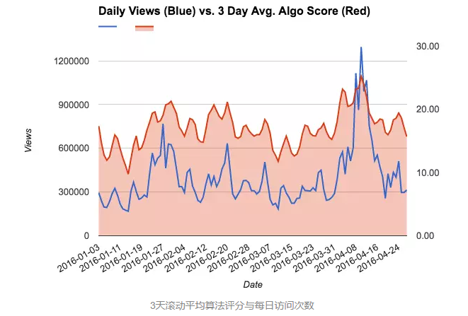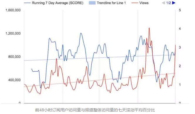 下面的第一张图表中,蓝线是前48小时订阅用户访问量,红线是前48小时订阅用户访问量与频道整体访问量的七天滚动平均百分比。 第二个图表显示了当天视频的访问次数与频道整体访问次数的百分比。