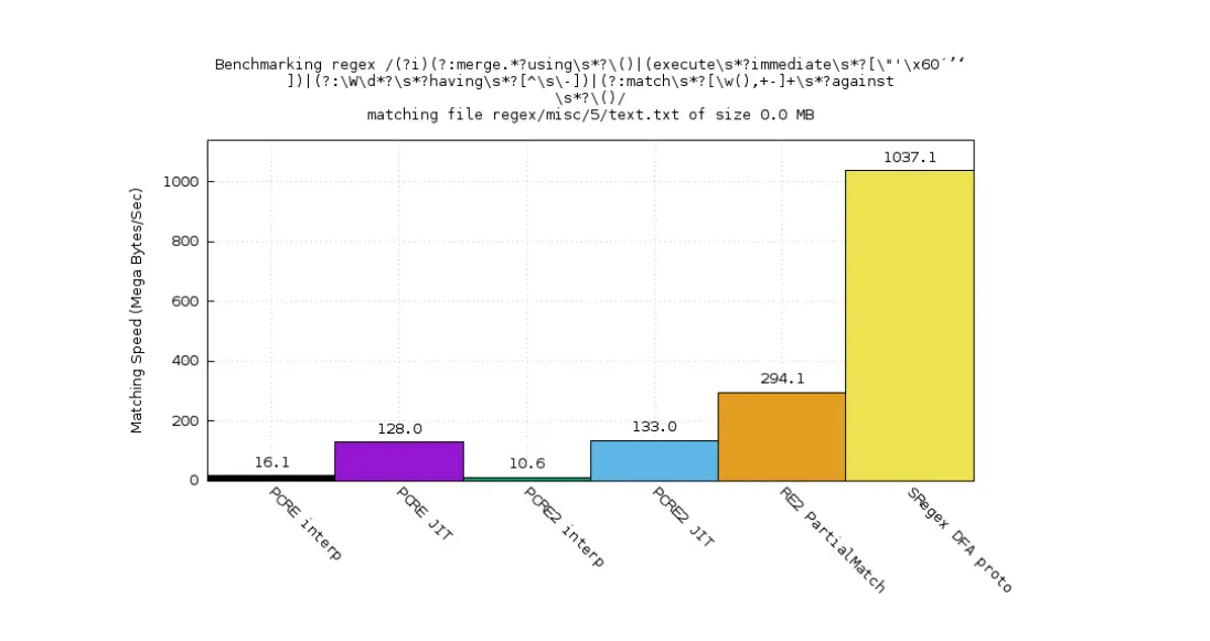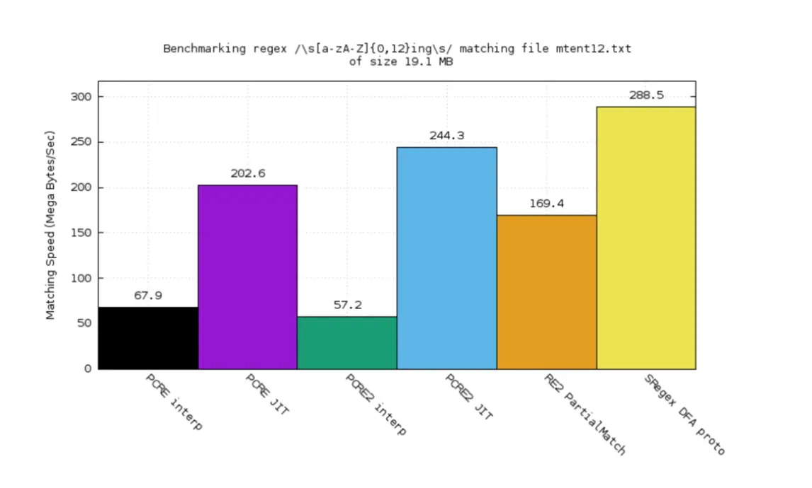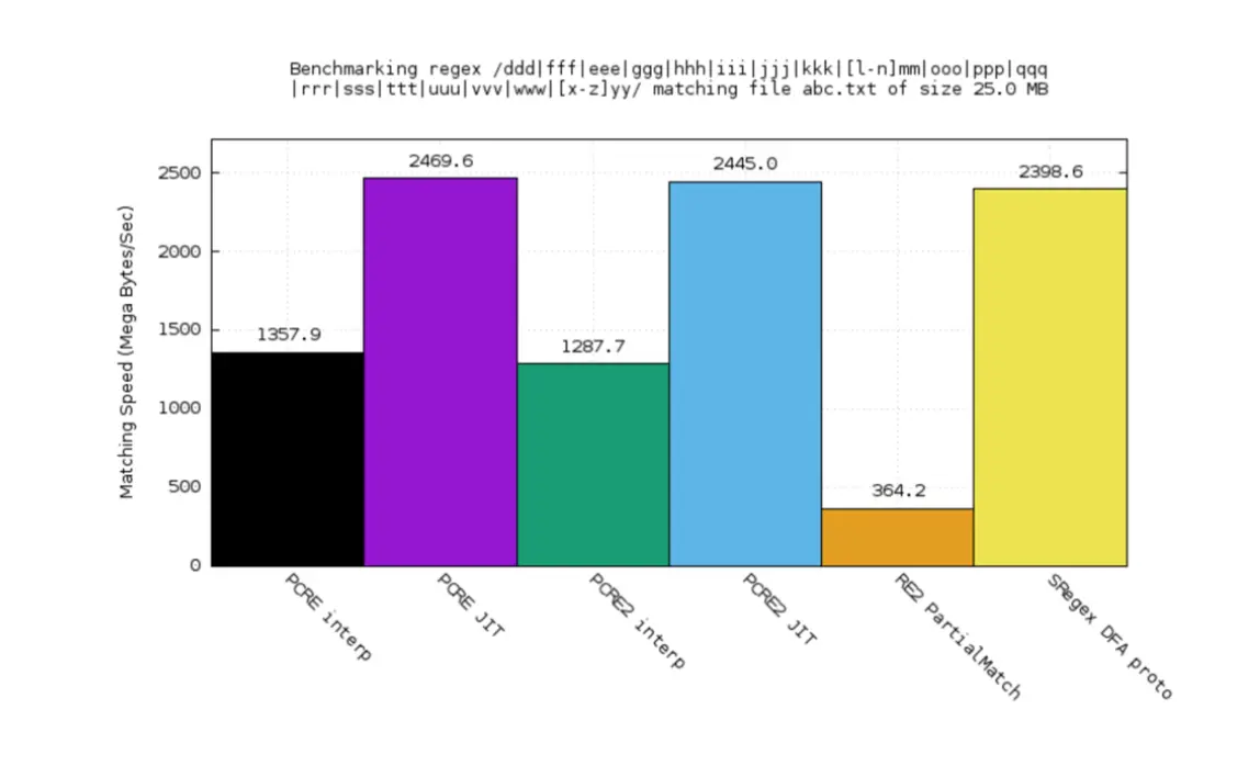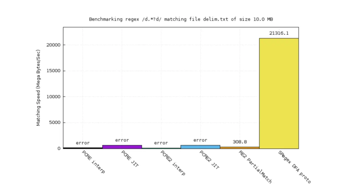 This use case is from PCRE’s benchmark test read. Also, we’re a bit better, the yellow one.