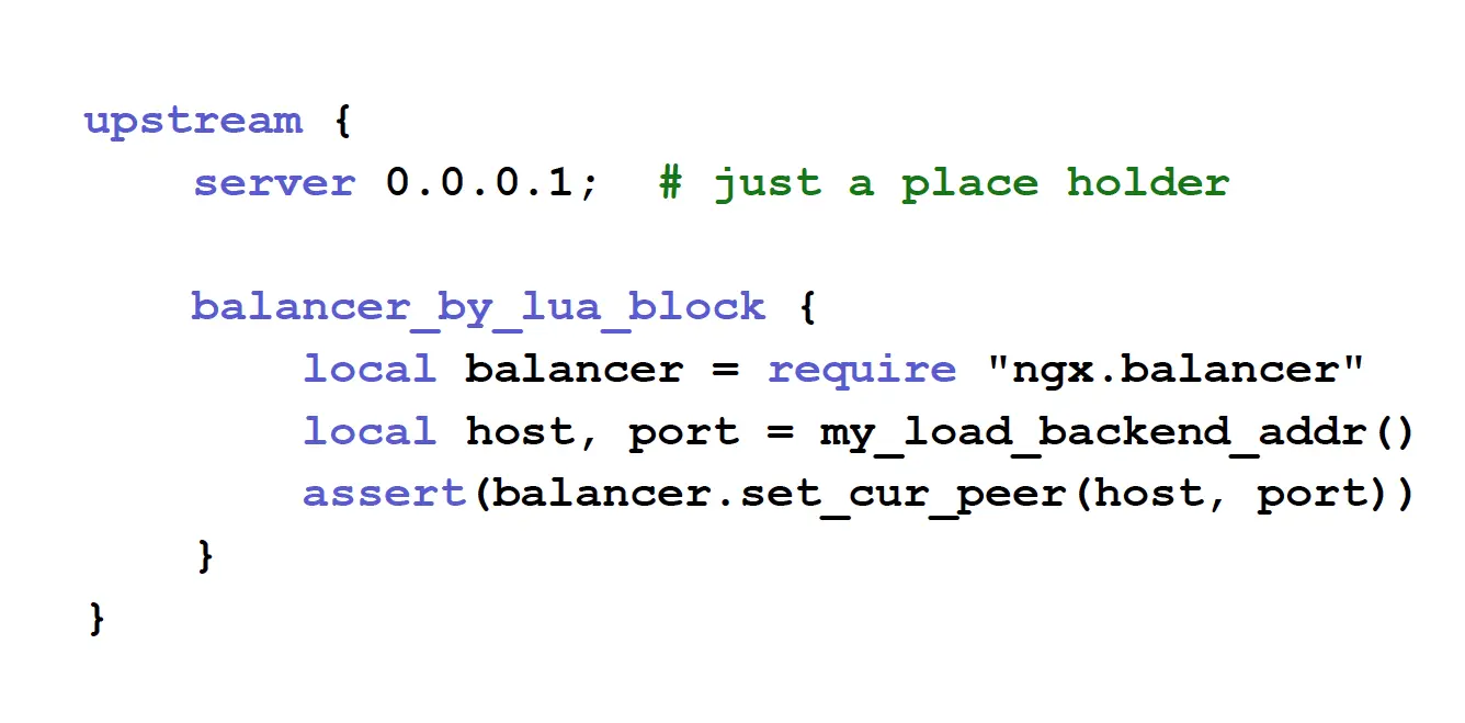 For example, in the traditional upstream configuration block, you can use a few lines of Lua code to define your own, complicated, dynamic balancers.
