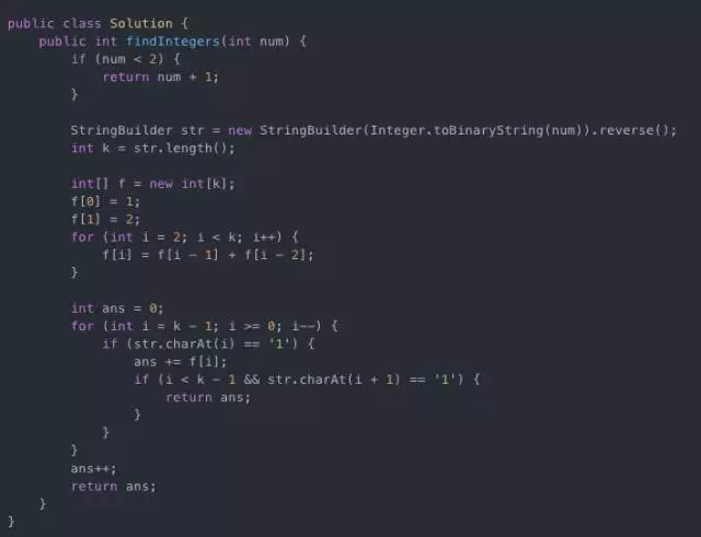 前一个部分即0到2^(k-1)-1,这部分中满足条件的答案为f(k-1);第二部分则需进一步讨论:如果n的二进制从左往右第二位为1,即n的形式为11x……x,那么因为题目要求不能有连续的1,所以这一位只能取0,这样的数一定小于n,所以后k-2位不受大小的限制,答案为f(k-2),并结束计算;如果n的二进制从左往右第二位为0,即n的形式为10x……x,那么为满足不超过n的条件,第二位也只能取0,这样问题就变为从100……0到10x……x之间有多少满足条件的数,这样就可以继续对n的二进制的后k-2位进一步进行类似的讨论。