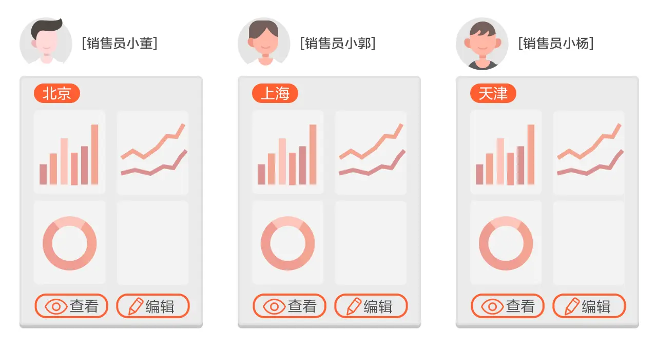 有一家公司的员工分布在全国各地,为了便于数据的管理和使用,想要不同地区的销售只看得到自己负责地区的数据,可以通过权限管理设置,实现数据源头的安全控制。同一张分析图表,不同员工只能看到自己负责的用户数据。
