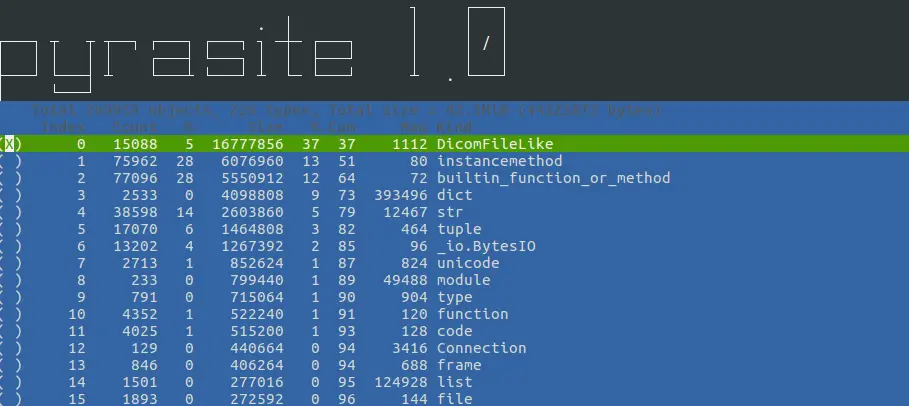 可以看到占用内存最多的是DicomFileLike这种类型的对象.已经达到上万个, 这是不能忍受的.就目前来看可能会有上边说的两种内存泄露原因导致不能回收这个对象.打开pyrasite-shell