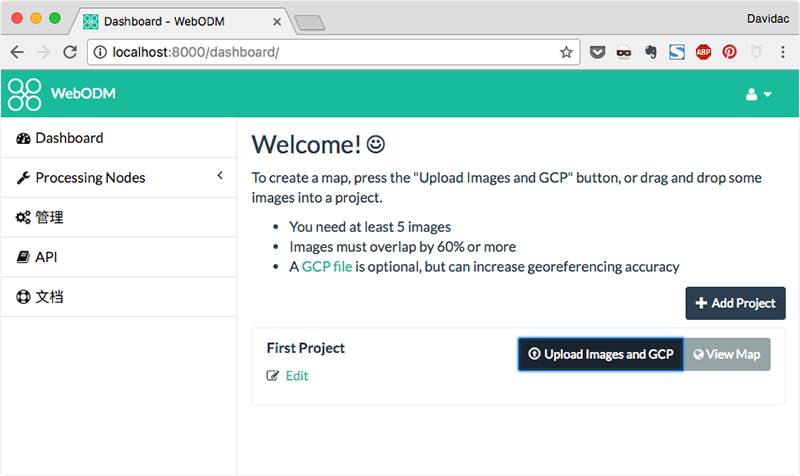 根据提示,MacOS 的用户在浏览器中输入 http://localhost:8000/ 就能看到 WebODM 的「尊容」了,而 Windows 用户则需要通过 docker-machine ip 查询到 Docker Machine 的 IP,然后在浏览器中输入 http://<yourDockerMachineIp>:8000 也能启动 WebODM。